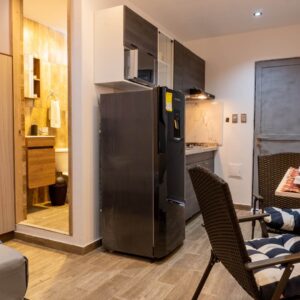Se le entrega completamente equipado, con utensilios de cocina, platos, vasos, cubiertos, tazas, ollas, sartenes, licuadora, cafetera, horno microondas, nevera y estufa, además de lencería básica de camas y toallas.